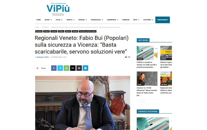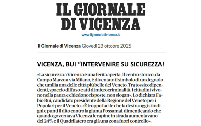 - REGIONALI VENETO: FABIO BUI (POPOLARI) SULLA SICUREZZA A VICENZA: “BASTA SCARICABARILE, SERVONO SOLUZIONI VERE”
