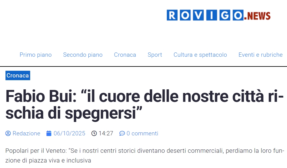 - Popolari per il Veneto – Fabio Bui: “Il cuore delle nostre città rischia di spegnersi”