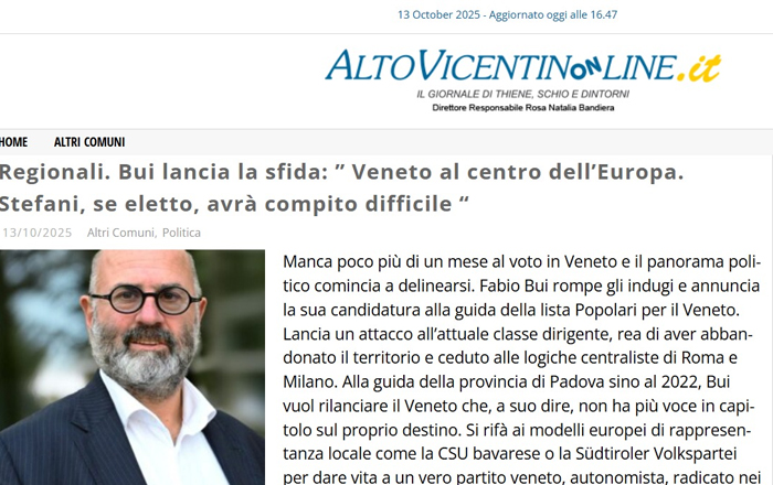 - Regionali. Bui lancia la sfida: “Veneto al centro dell’Europa. Stefani, se eletto, avrà compito difficile”