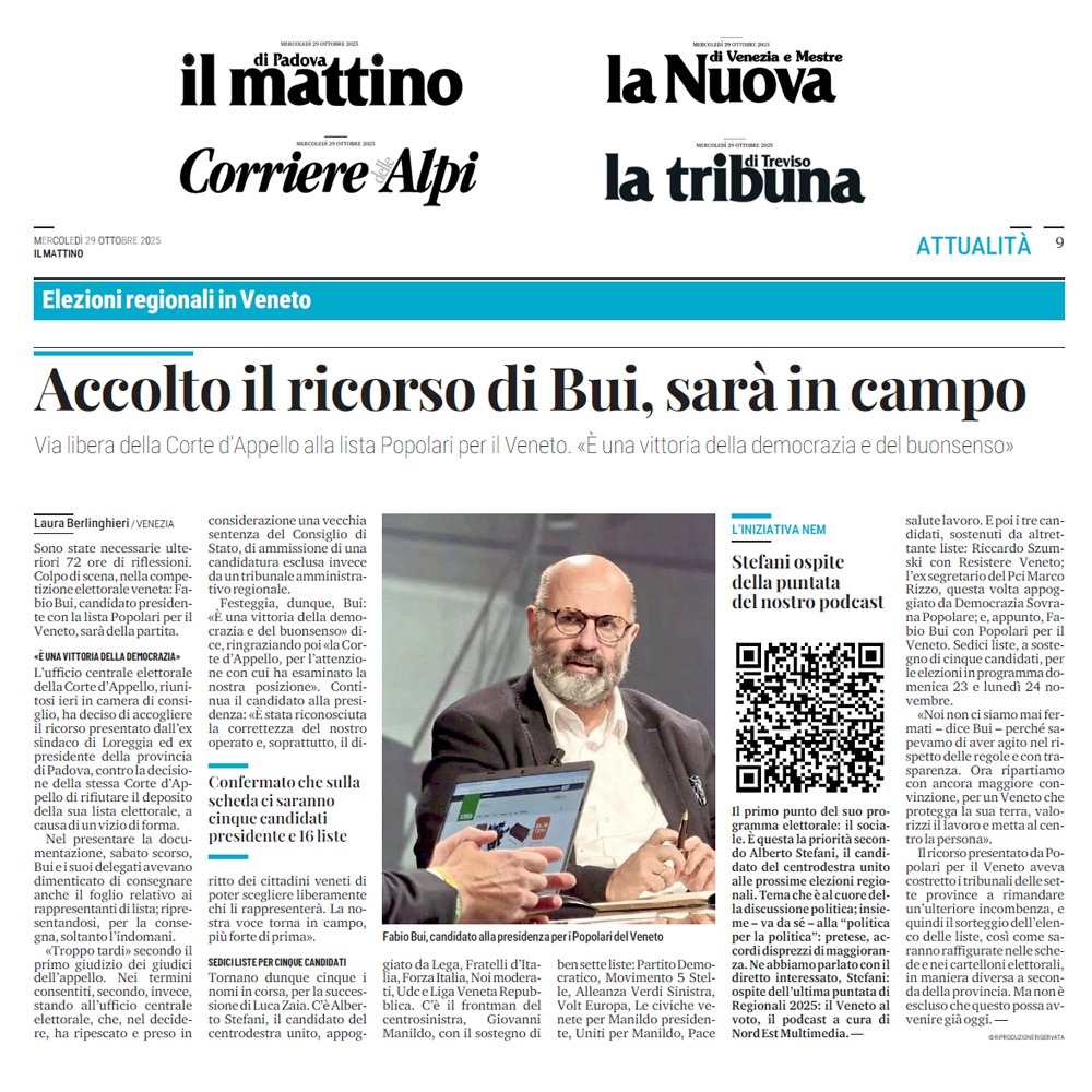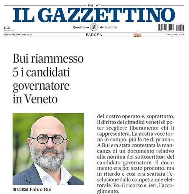 - FABIO BUI: “RICORSO ACCOLTO. LA NOSTRA CORSA CONTINUA. VINCE LA DEMOCRAZIA, VINCE IL VENETO CHE VUOLE CONTARE”